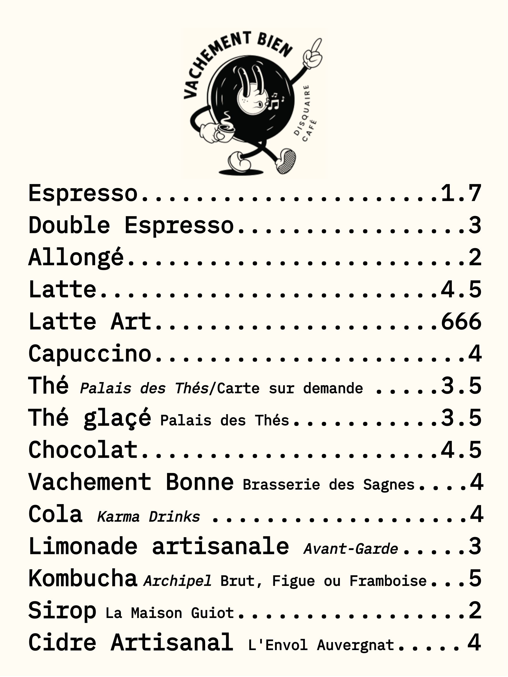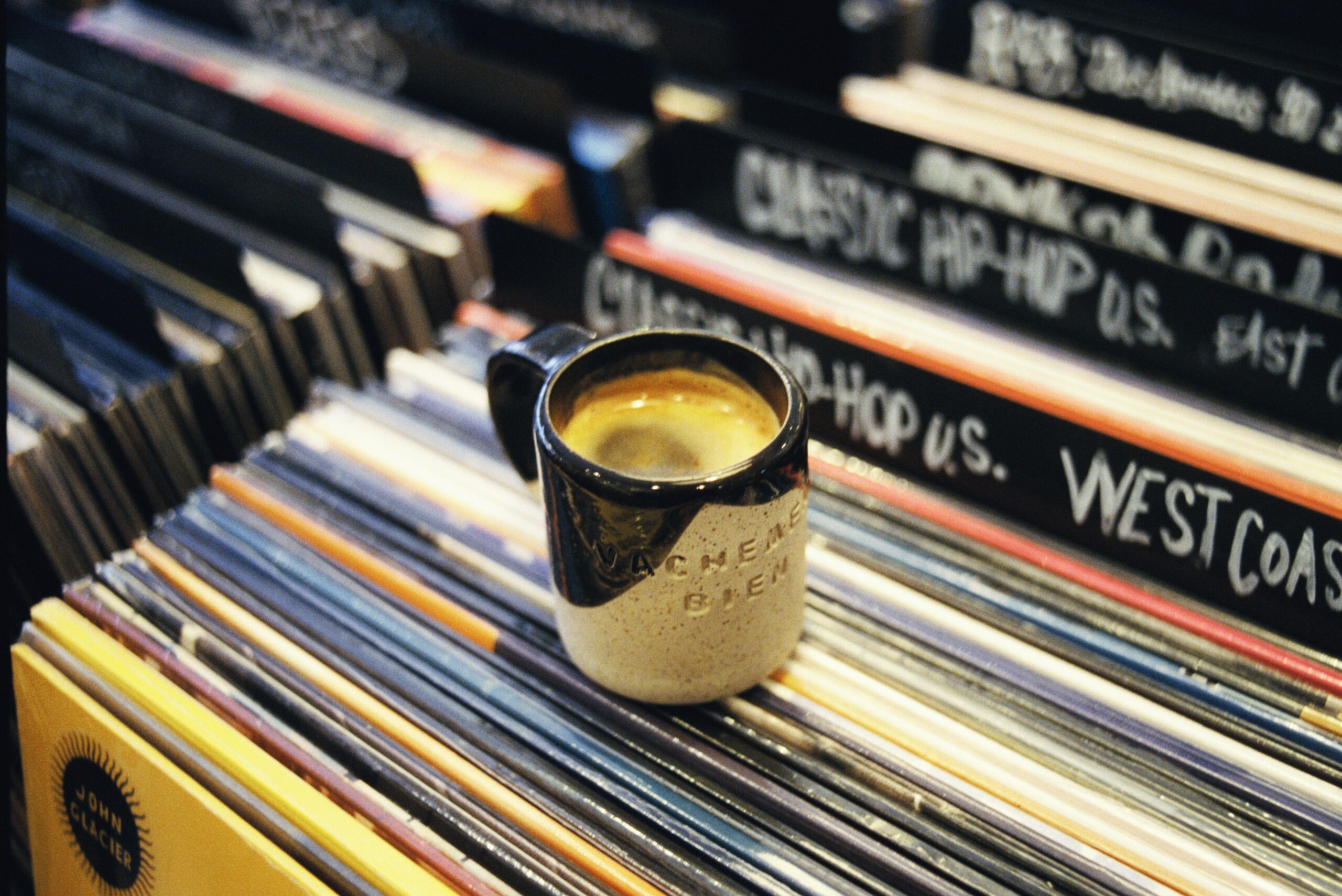 Vachement Bien est disquaire mais aussi un café. Vous pourrez donc retrouver au comptoir du magasin un café de spécialité fraichement torréfié par Aurélien de Clinton Hill, mais également une sélection de thés et diverses boissons chaudes et froides à consommer sur place, ainsi qu’une sélection de bières brassées par la micro-brasserie local Grizzly (à emporter uniquement).